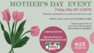 Enjoy painting two wooden 4×4 flowerpots at your own pace. You will also receive two flowers to put in them, provided by Samantha from the floral department in Pick n Save. While you’re painting, enjoy appetizers using Jones products!